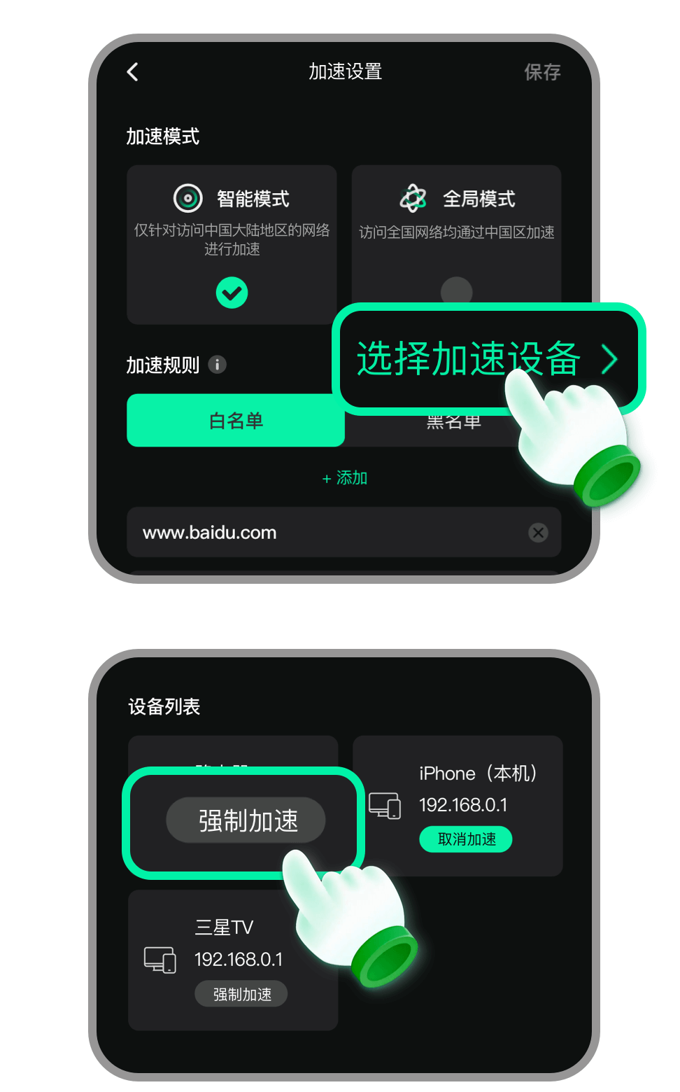 答:进入穿梭App路由器页面,打开穿梭设置,在白名单中增加设备IP,或者点击“选择加速设备”,直接指定连接设备进行加速。
